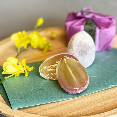 ワインレッドの見た目が美しい「紫苑(しえん)」を1粒ずつ丁寧に求肥で包んだ「ひとつぶの紫苑」と「ひとつぶのマスカット」用に栽培されたマスカットオブアレキサンドリアを使用した「マスカットジャム」の詰め合せです。
