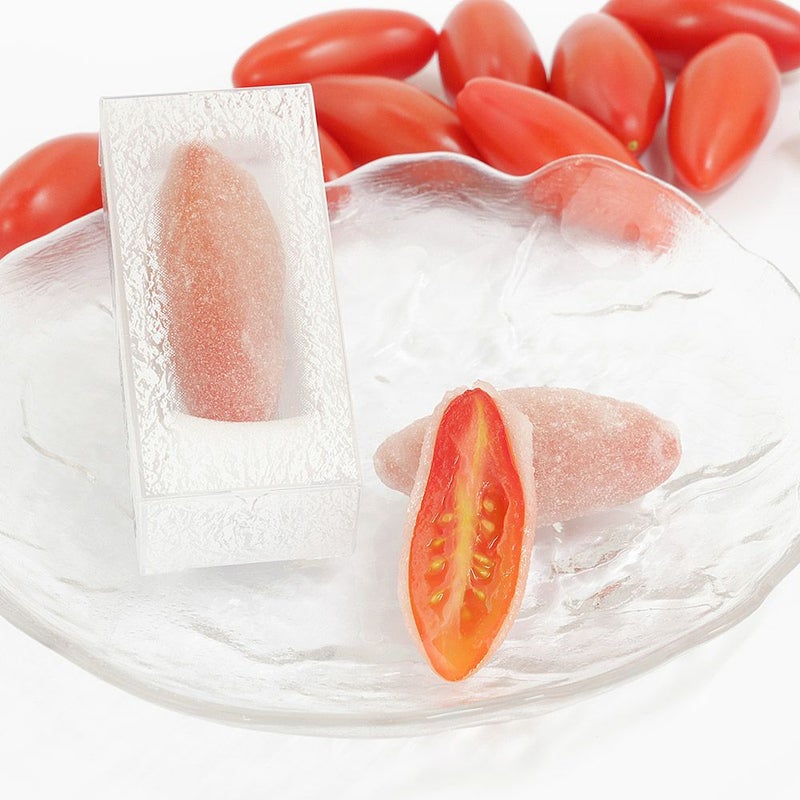 『乙女の涙(スウィーティア)』は、皮が肉厚でしっかりしているため従来のトマトとは違うプリッとした食感が楽しめます。果実のような甘さのトマトとまわりを包む求肥とのバランスが抜群のお菓子に仕上がりました。