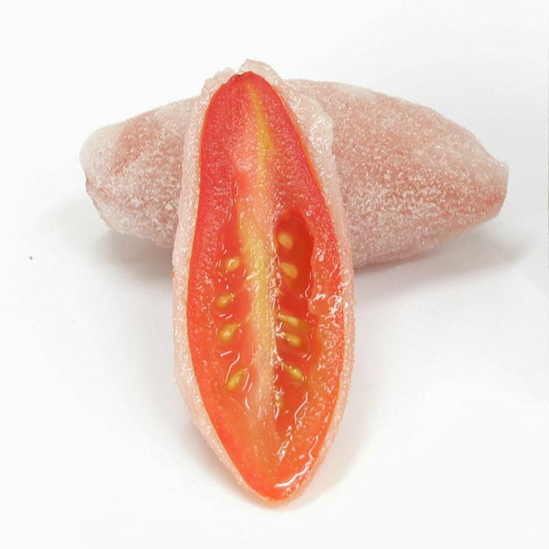 『乙女の涙(スウィーティア)』は、皮が肉厚でしっかりしているため従来のトマトとは違うプリッとした食感が楽しめます。果実のような甘さのトマトとまわりを包む求肥とのバランスが抜群のお菓子に仕上がりました。