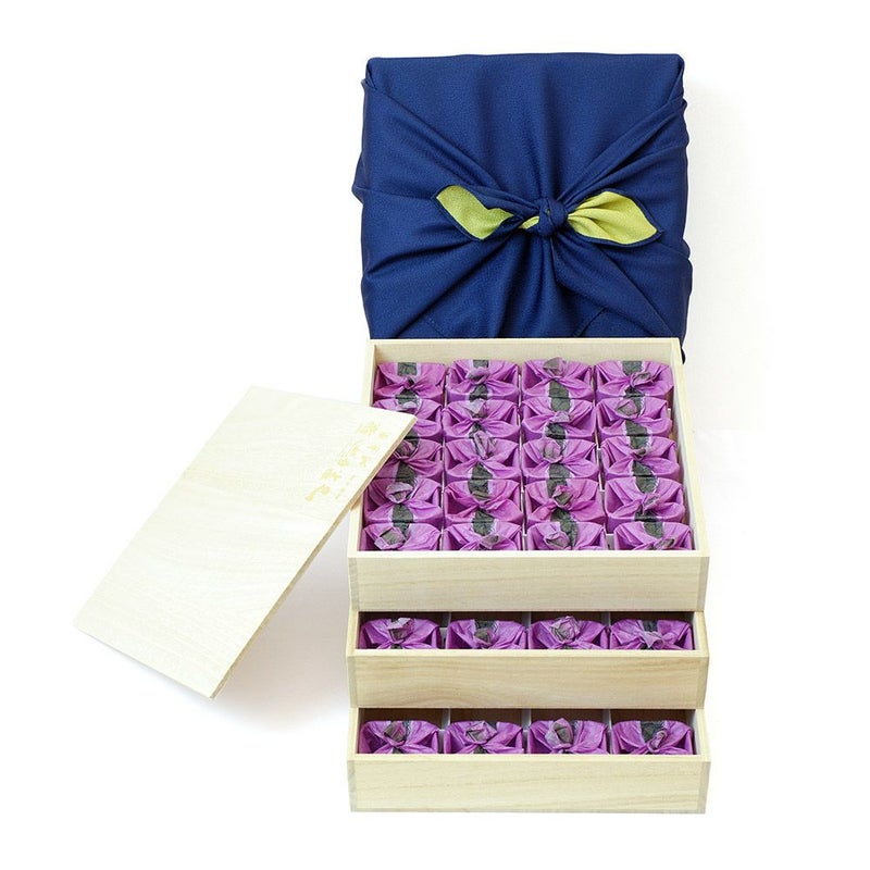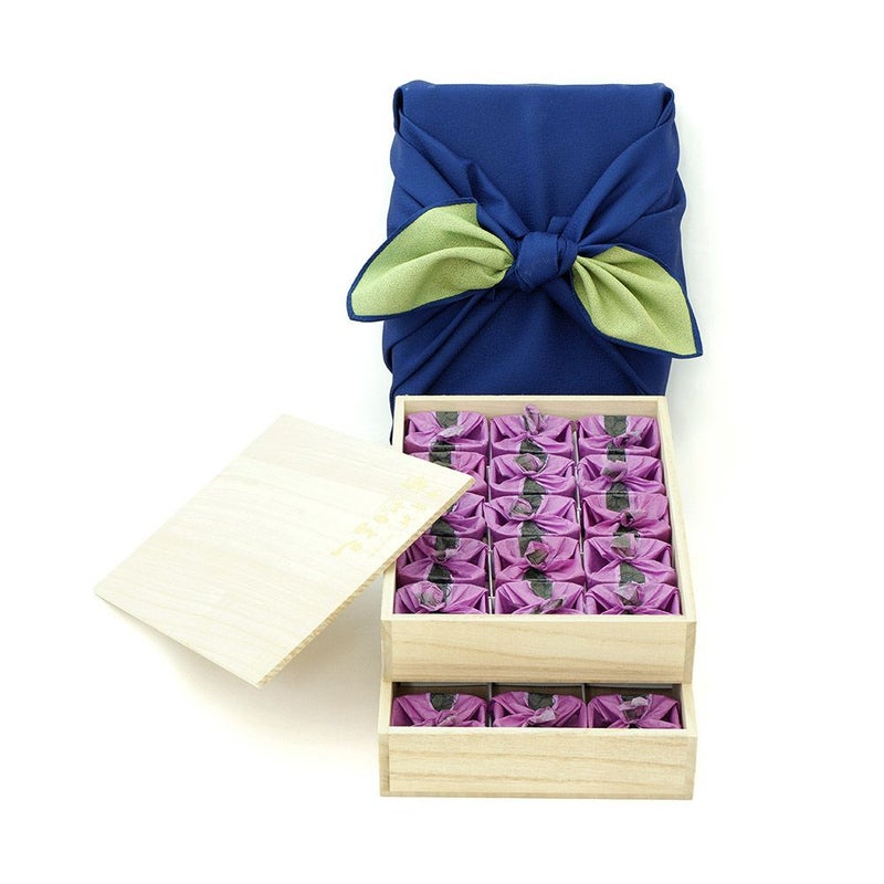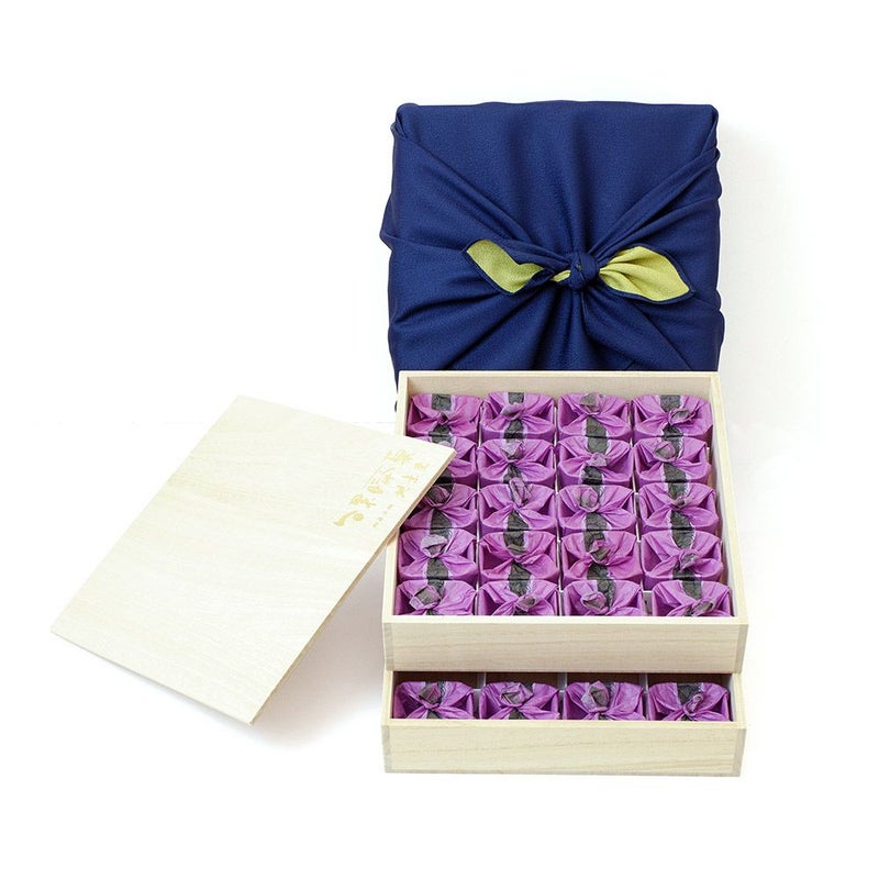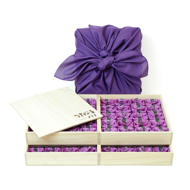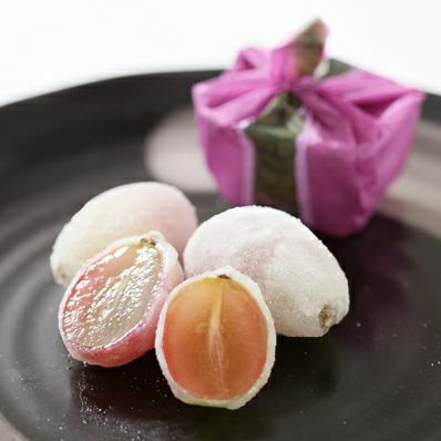 共楽堂では手包みにこだわり、熟練の技術を持った職人が新鮮な紫苑をひとつひとつ丁寧に求肥で包んで、心を込めてお客様にお届けしています。