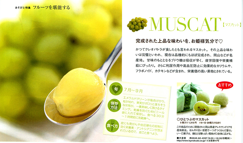 フリーペーパー「ぱどタウンマガジン[大阪東版]」の ≪あそびと特集&フルーツを堪能する≫コーナーにひとつぶのマスカットが紹介されました。