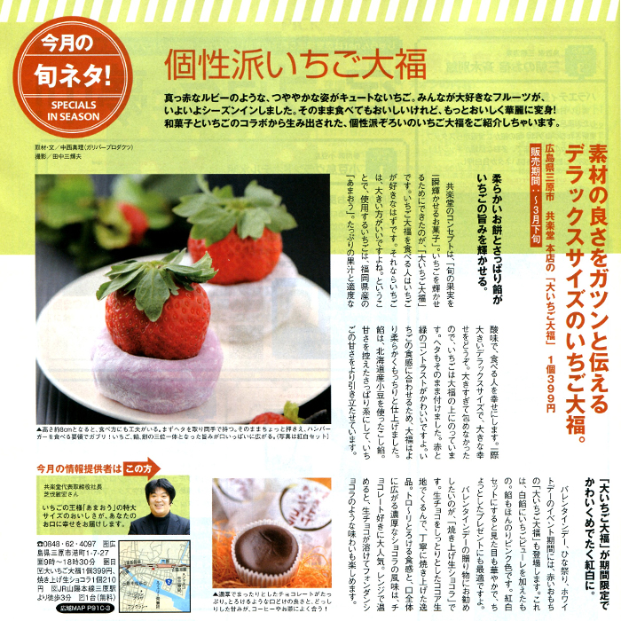リクルート「じゃらん中国・四国版」3月号(2月1日発売)今月の旬ネタコーナーに大いちご大福、紅白大いちご大福、焼き上げ生ショコラが紹介されました。